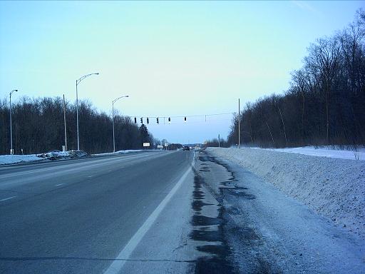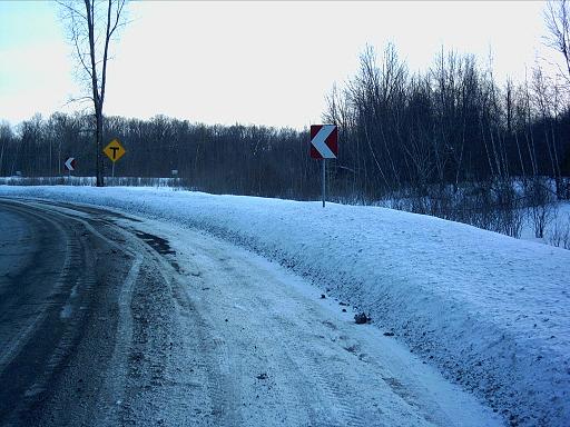 Quand on regarde de cet angle, voyez la différence entre les arbres matures et les nouvelles repousses, qui se situe tout juste au-dessus du panneau avec la flèche blanche sur fond rouge. Les arbres ont été abattus en fonction d’y construire des bretelles d’entrée et de sortie. La même chose devait se faire de l’autre côté, mais le déboisement n’a pas été effectué.