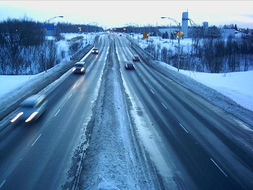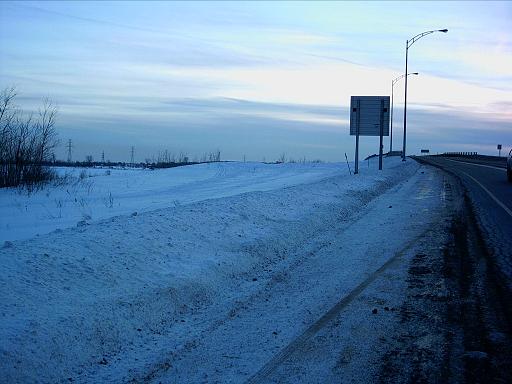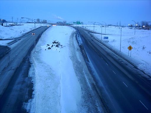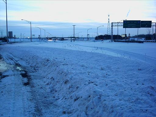 Vue en direction est, cette fois, depuis le même viaduc. Les deux chaussées sont plus éloignées l’une de l’autre, si on regarde le déneigement effectué. Dans les faits, les deux chaussées sont tout aussi rapprochées, mais ce qu’on voit ici, ce sont les « voies de service » du grand échangeur qui connecte la route 158 à l’autoroute 31. Si vous regardez au-dessus de l’espèce d’amoncellement, entre les deux voies, un peu vers la droite, vous voyez deux petits points foncés; il s’agit de deux balises, qui marquent a fin des chaussées rapprochées, qui n’avaient pas été construites à l’époque.