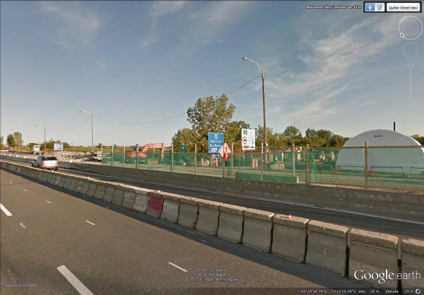 D’abord, vers l’est, juste avant de traverser le pont Michel-Chartrand (eh oui, le pont de l’A-10 traversant le canal de Chambly, et la rivière Richelieu, porte ce nom depuis le 20 mai dernier!), on voit le premier de deux panneaux bleus indiquant la sortie 29, conduisant à la route 133, en direction d’Iberville (maintenant une partie de la ville de Saint-Jean-sur-Richelieu), et de Richelieu. La pose de Google Street View est éloignée parce que lors du passage du “Street View Car”, le pont sud était en reconstruction, et la circulation était déviée sur le pont nord.