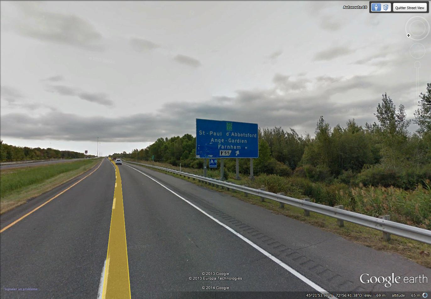 L’autre échangeur où l’on voit encore des panneaux bleus est la sortie 55, située juste au nord du village de l’Ange-Gardien, qui mène à la route 235, vers Saint-Paul-d’Abbotsford, Saint-Pie, et Farnham. Voici le premier panneau, en direction est,…