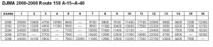 En cliquant sur cette carte, vous la verrez en plein écran.  Elle décortique la route 158 en 16 sections*, pour lesquelles des mesures de DJMA ont été effectuées entre 2000 et 2008.  Les sections sont numérotées, de Saint-Jérôme à Berthierville, et sont décrites sur la carte.  Les mesures de DJMA sont compilées sur le tableau suivant.