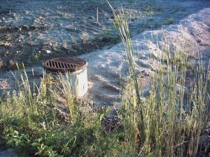 …alors que si l’on regarde vers le nord, la conduite n’est pas encore recouverte. Au loin, à droite, c’est la route 105.