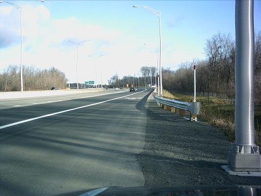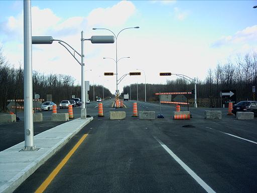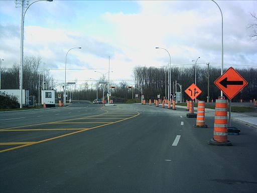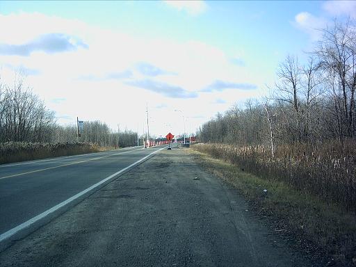 Ça, c’est le viaduc de la route 321, vu du dessus. On voit bien le panneau, muni de feux clignotants, qui signale que le « deux-dans-un » est – ou plutôt sera – à 1 kilomètre du pont. Sur l’A-50, nous regardons vers l’est. Si vous vous demandez pourquoi la signature de la photo n’est pas en bordure, regardez un peu au-dessus de celle-ci (cliquez dessus, pour la voir en grand format), et vous verrez l’infâme intimidateur, envoyé par les gens de la place, pour épier tous mes gestes. Pour fins d’identification, ainsi que pour simplifier le texte, nous l’appellerons « le chien ».