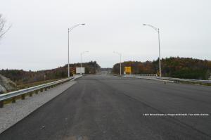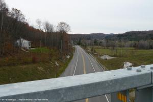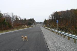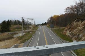 Ça, c’est le viaduc de la route 321, vu du dessus.  On voit bien le panneau, muni de feux clignotants, qui signale que le « deux-dans-un » est – ou plutôt sera – à 1 kilomètre du pont.  Sur l’A-50, nous regardons vers l’est.  Si vous vous demandez pourquoi la signature de la photo n’est pas en bordure, regardez un peu au-dessus de celle-ci (cliquez dessus, pour la voir en grand format), et vous verrez l’infâme intimidateur, envoyé par les gens de la place, pour épier tous mes gestes.  Pour fins d’identification, ainsi que pour simplifier le texte, nous l’appellerons « le chien ».