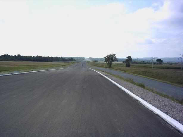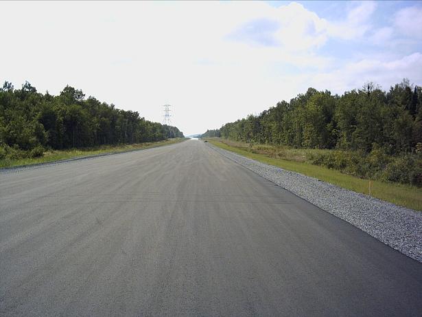Voici la chaussée de l’A-50, en direction ouest (photo prise en regardant vers l’est), à la hauteur de la route 148, juste à l’ouest de Lachute.  On voit distinctement l’asphalte qui fut appliqué lors de la construction de l’échangeur, en 2005 ou 2006, et la nouvelle couche, fraîchement appliquée.