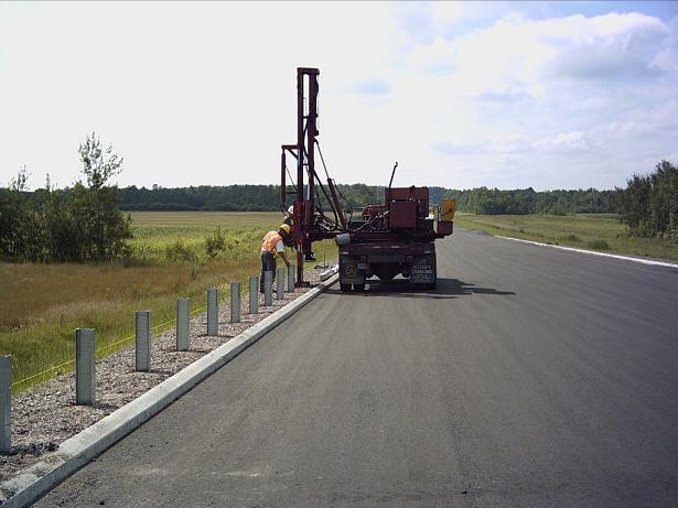 Deux travailleurs installant les poteaux de soutien de la glissière, à l’aide d’une planteuse spéciale, montée sur un camion.