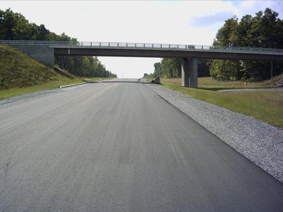 Je suis suffisamment près du viaduc pour voir une voie de dépassement qui commence, pour ceux qui rouleront en direction est.  De l’autre côté de la route, un rouleau compresseur.