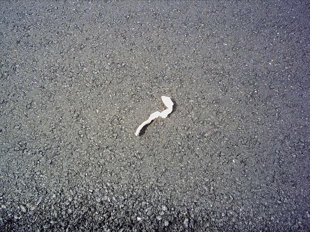 Vous verrez, sur cette photo, un autre type de « reste » humain.  Non, il ne s’agit pas de bouffe, cette fois, mais d’équipement de sécurité.  Eh oui, il s’agit bien de bouchons de protection contre le bruit.  J’en ai trouvé trois ou quatre paires, comme ça, le long des quelques centaines de mètres que j’ai marché, sur le gravier, afin de ne pas rouler sur l’asphalte frais avec ma bagnole.