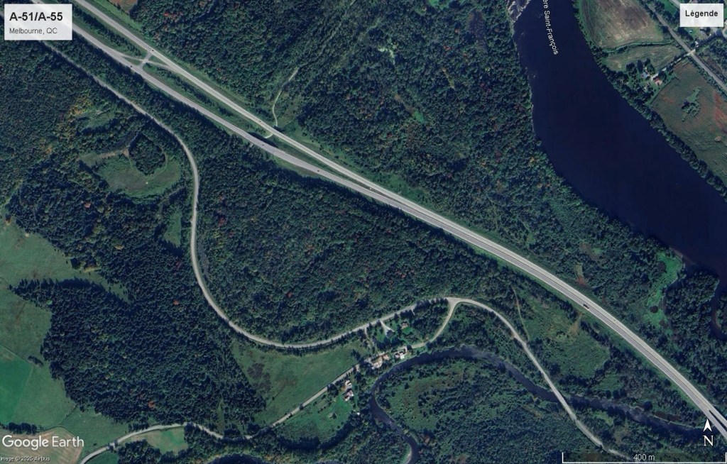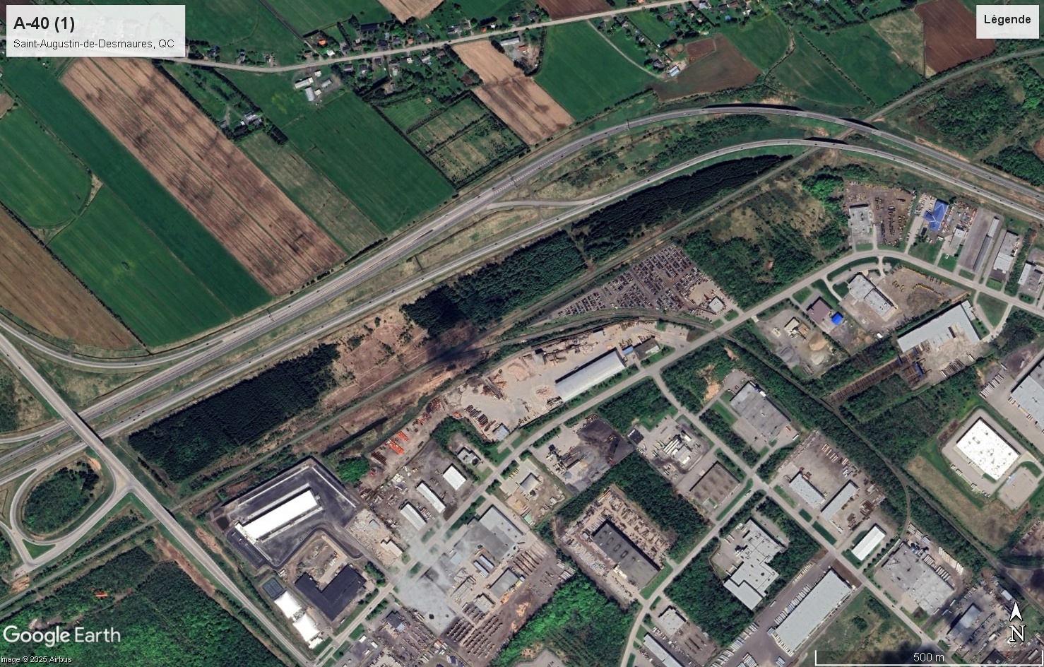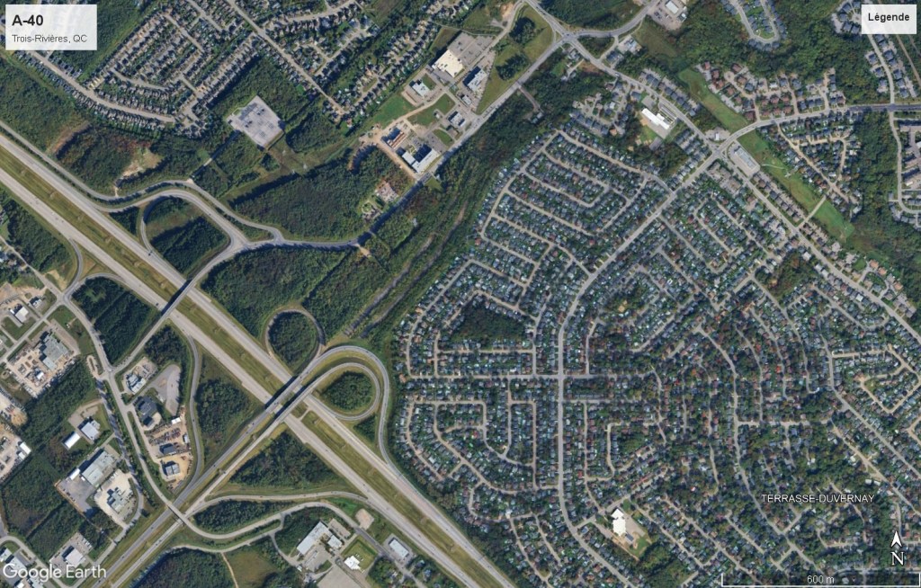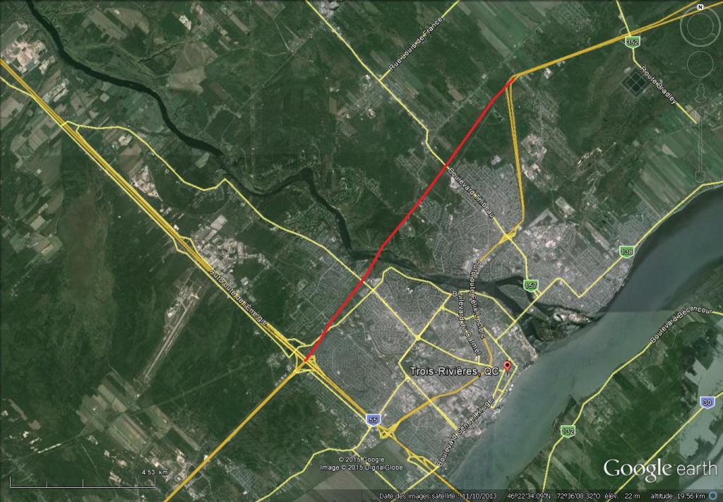 De nos jours, les finances ne sont toujours pas au rendez-vous, mais le volume de circulation y est; l’A-40, à l’endroit où a eu lieu l’accident d’aujourd’hui, supporte pas moins de 40,000 véhicules par jour, en débit journalier moyen annuel (DJMA), unité de mesure du volume de circulation. Il serait grandement temps de compléter ce “chaînon manquant” de l’A-40, à savoir l’axe est-ouest original de l’A-40, entre l’échangeur A-40/A-55 actuel, et la courbe du pont d’étagement de la rue Courteau, soit la ligne rouge, approximativement, sur la photo suivante, issue de Google Earth, et modifiée par votre humble serviteur.