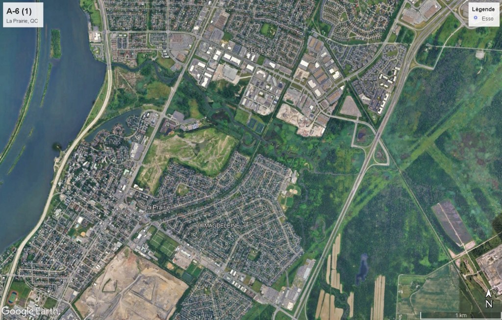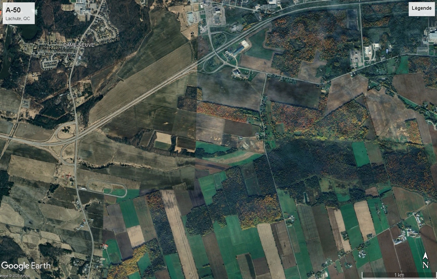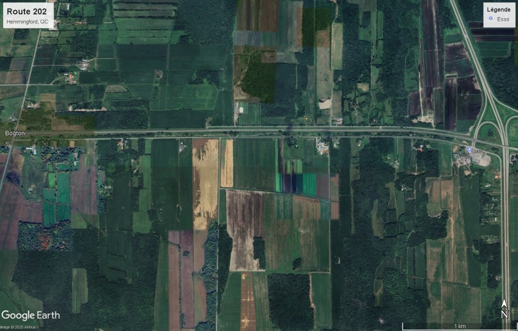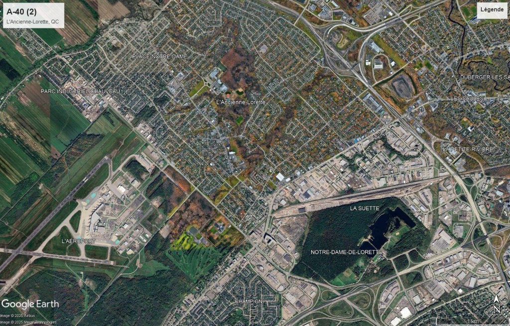 De nos jours, les finances ne sont toujours pas au rendez-vous, mais le volume de circulation y est; l’A-40, à l’endroit où a eu lieu l’accident d’aujourd’hui, supporte pas moins de 40,000 véhicules par jour, en débit journalier moyen annuel (DJMA), unité de mesure du volume de circulation. Il serait grandement temps de compléter ce “chaînon manquant” de l’A-40, à savoir l’axe est-ouest original de l’A-40, entre l’échangeur A-40/A-55 actuel, et la courbe du pont d’étagement de la rue Courteau, soit la ligne rouge, approximativement, sur la photo suivante, issue de Google Earth, et modifiée par votre humble serviteur.