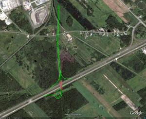 Parmi les commentaires reçus, celui de Stéphane Dumas, un lecteur, et commentateur, de longue date, du blogue de Richard3, qui me faisait remarquer, par l’entremise d’un lien vers Google Maps, que l’un des viaducs, de l’échangeur A-40/A-440, est suffisamment large pour permettre beaucoup plus de circulation qu’il ne le fait actuellement.  En y jetant un oeil, on voit qu’il y a tout l’espace nécessaire pour y mettre trois voies!  L’idée m’a donc pris, en ce lundi pluvieux, de faire comme d’autres blogueurs, et d’élaborer une théorie à partir de diverses vues obtenues via le logiciel Google Earth.  Cela donnerait quelque chose comme ceci.