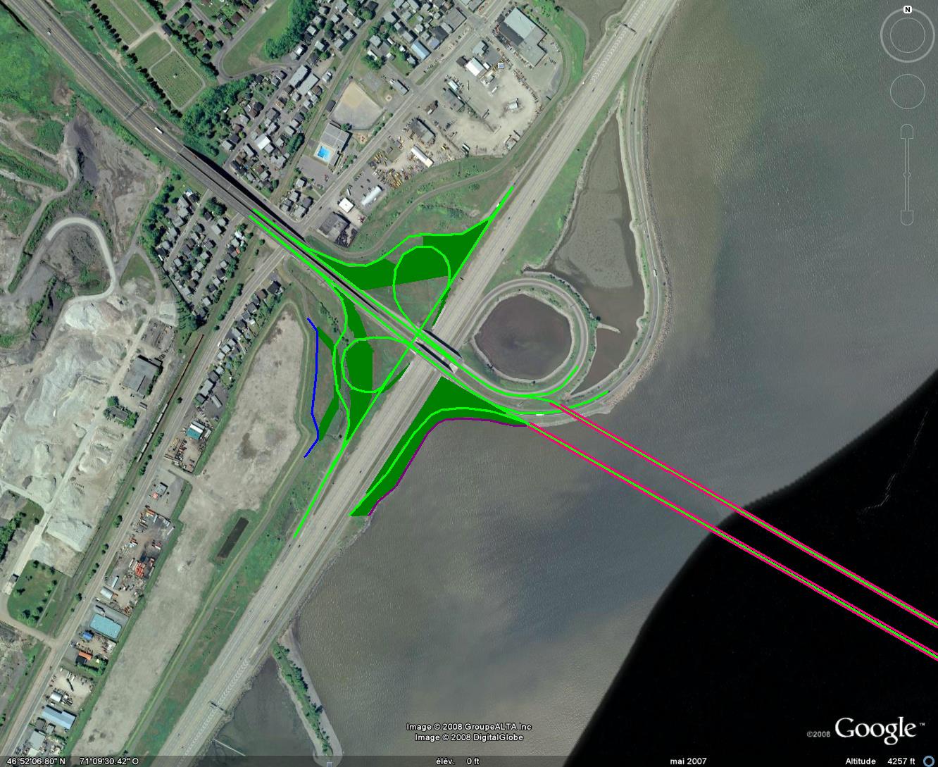 En regardant l’échangeur de plus près, on constate que quelques modifications seraient évidemment nécessaires.  Entre autres, j’ai ajouté un agrandissement de la jetée, afin de permettre la construction de la bretelle vers la rive-sud, mais il faudrait probablement la modifier aussi, afin de construire des culées des deux ponts.  Ceux-ci pourraient être simplement des ponts à poutres, tout ce qu’il y a de plus conventionnel, pour traverser les quelques deux kilomètres et demi qui séparent la rive nord du fleuve, et l’île d’Orléans.  Il s’agira de construire quelques travées plus élevées, afin de permettre la navigation de plaisance.