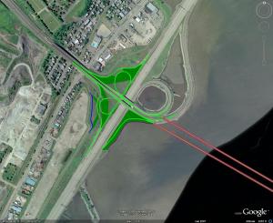 En regardant l’échangeur de plus près, on constate que quelques modifications seraient évidemment nécessaires. Entre autres, j’ai ajouté un agrandissement de la jetée, afin de permettre la construction de la bretelle vers la rive-sud, mais il faudrait probablement la modifier aussi, afin de construire des culées des deux ponts. Ceux-ci pourraient être simplement des ponts à poutres, tout ce qu’il y a de plus conventionnel, pour traverser les quelques deux kilomètres et demi qui séparent la rive nord du fleuve, et l’île d’Orléans. Il s’agira de construire quelques travées plus élevées, afin de permettre la navigation de plaisance.