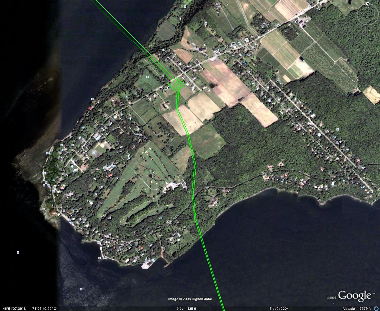 La ligne verte, ajoutée sur l’image, montrerait le trajet approximatif d’une telle traversée, depuis l’échangeur A-40/A-440 jusqu’à l’autoroute 20, en passant par l’île d’Orléans.