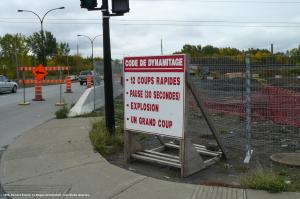 Il me fut impossible de m’approcher davantage du chantier du pont de la rivière de la Petite-Nation. Il faudra que j’y retourne. Nous voyons quand même, depuis le chemin Malo, la flèche de la grue, qui dépasse la cime des arbres, à gauche, le chantier comme tel, à droite, avec des poutres d’acier, destinées au pont, et à l’avant-plan, un panneau que l’on ne voit plus, sur les routes du Québec, depuis longtemps. Les panneaux de ce genre ont tous été remplacés par d’autres, où l’on voit un camion descendant une pente, ainsi que le pourcentage d’accélération.