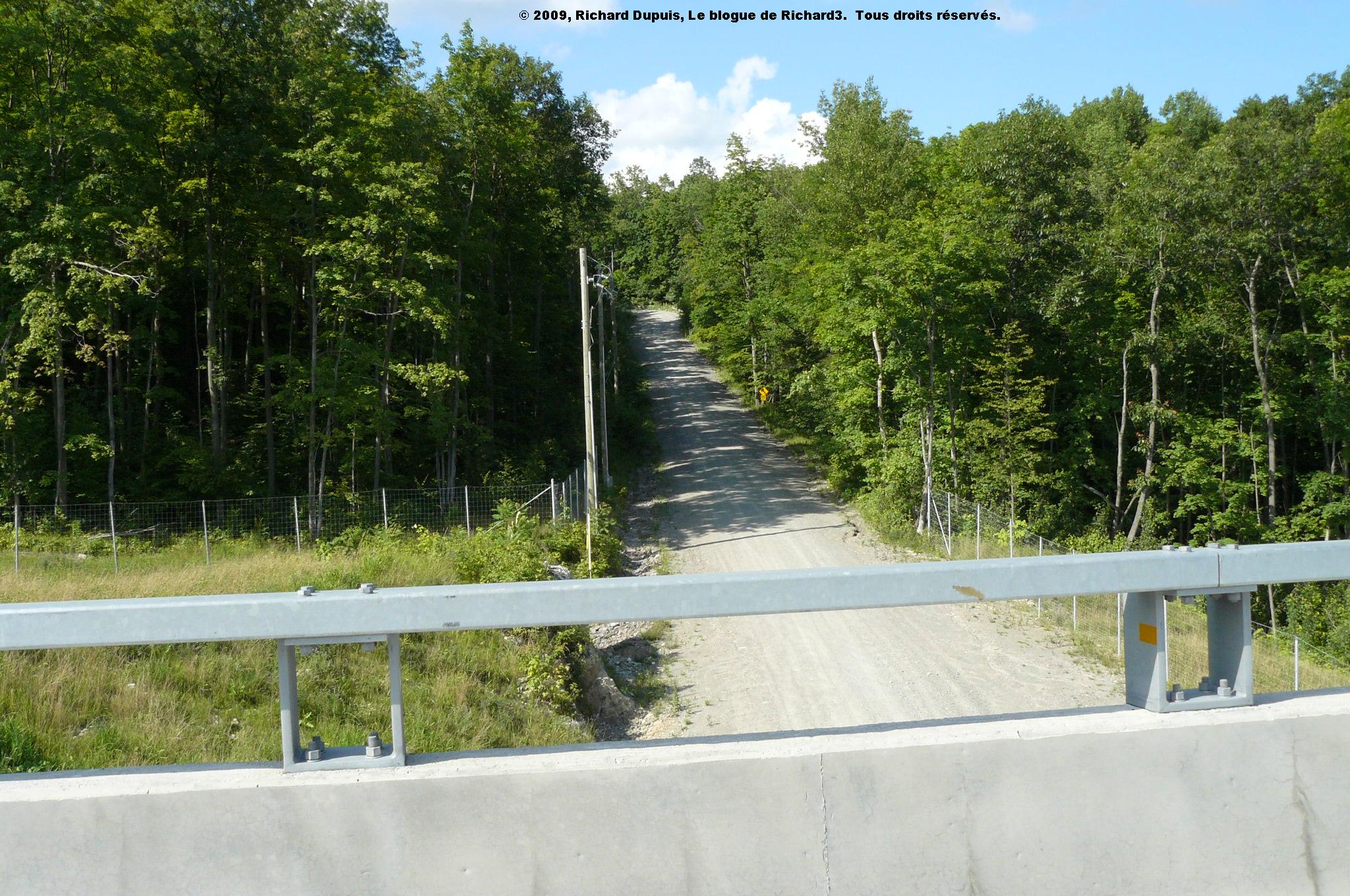 En terminant, voici une autre vue imprenable, que vous verrez lorsque vous roulerez sur l’A-50, quelque part à l’automne de 2010, s’il n’y a pas d’autres reports d’ouverture.  Là où la route 148 disparaît dans les branches des arbres, vous voyez quelque chose de bleu, avec du jaune, qui vous semble connu.  Eh oui, il s’agit de l’affiche de la station Ultramar, près de la traverse de la voie ferrée, à Grenville-sur-la-Rouge (Calumet).