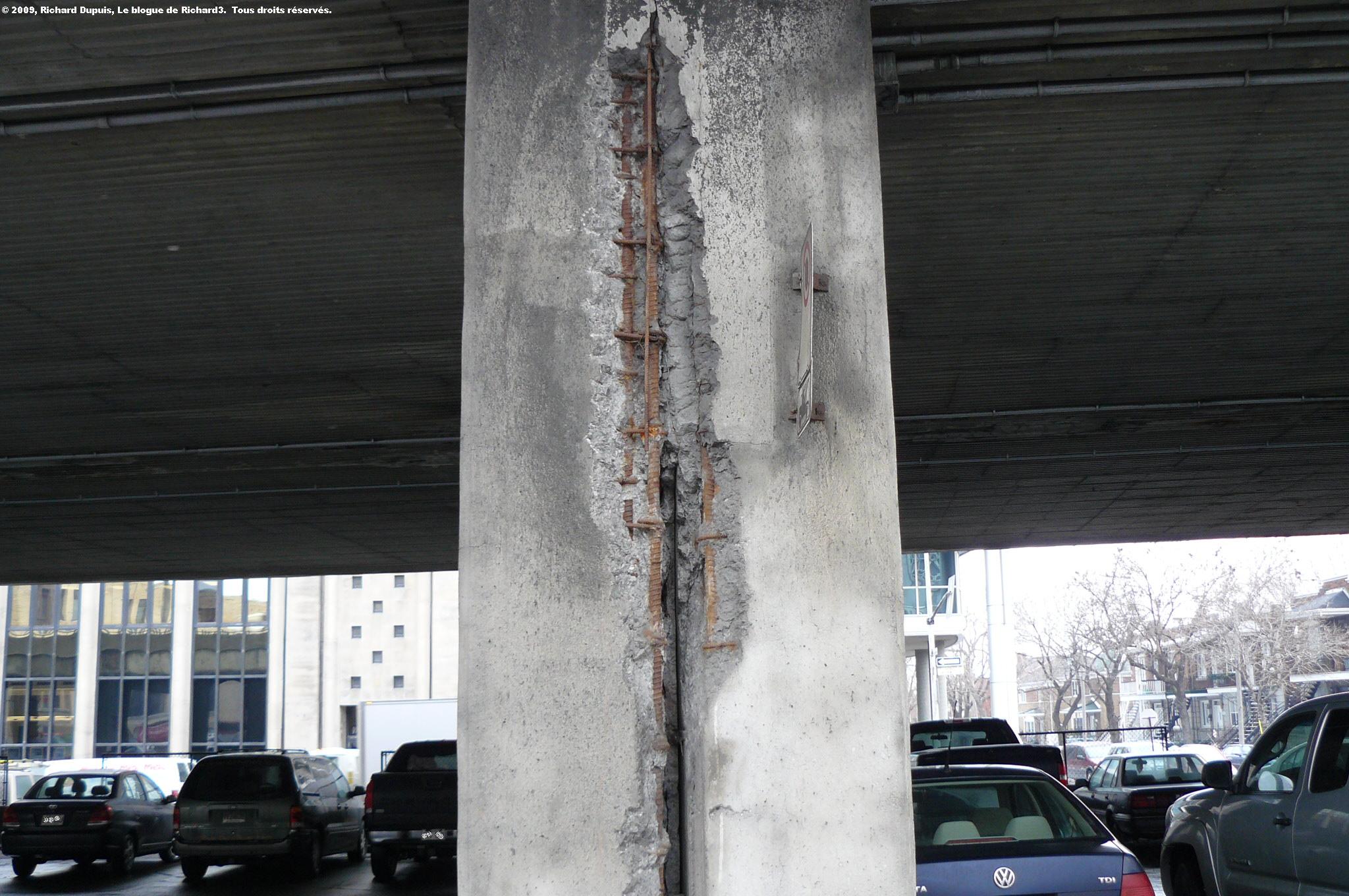 Même dans la partie centrale du rond-point du boulevard Saint-Laurent, le béton des piliers s’est effrité.  Mais il y a quelque chose de coincé, le long du tuyau.  Voyons voir de plus près.