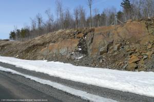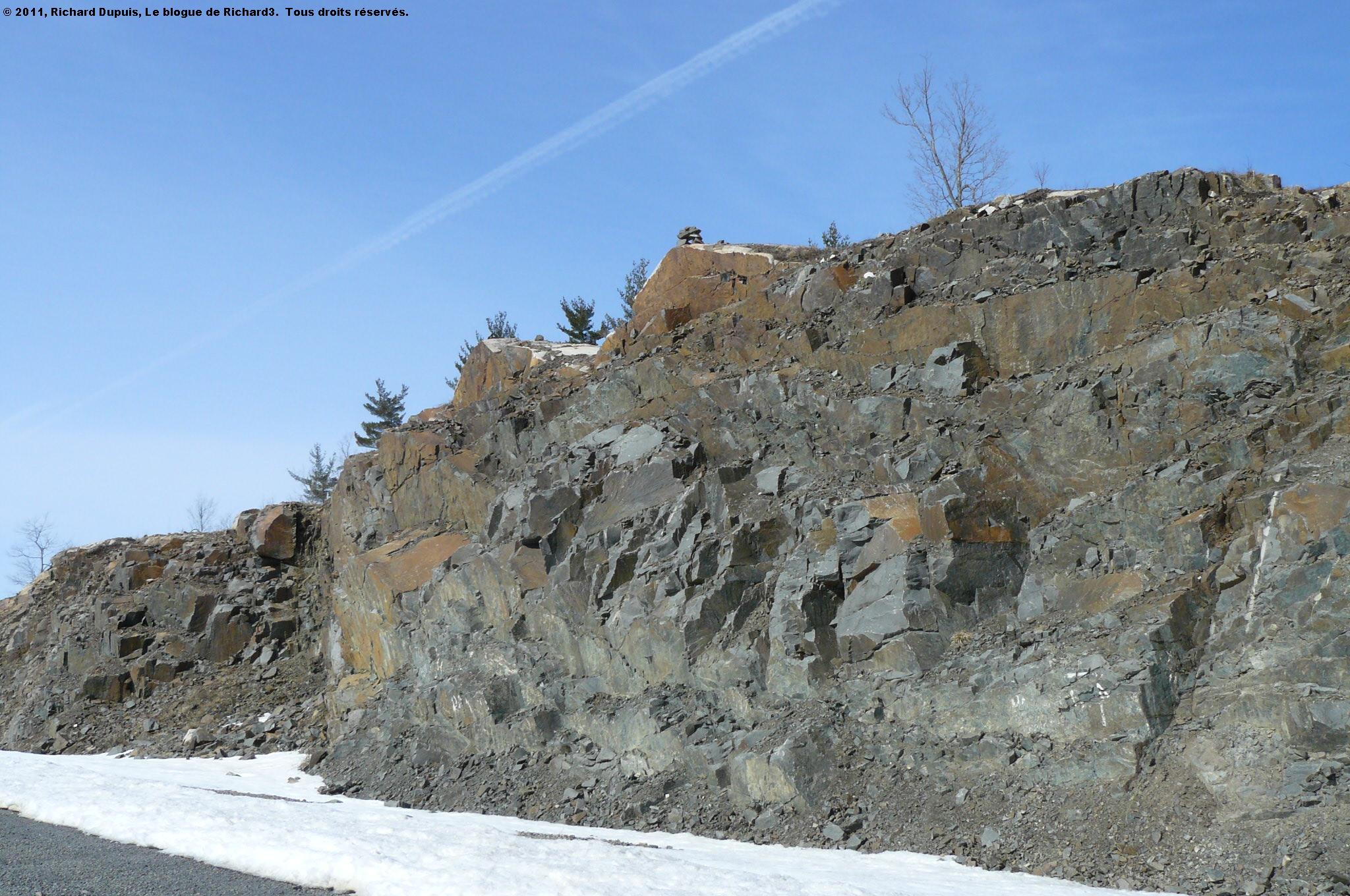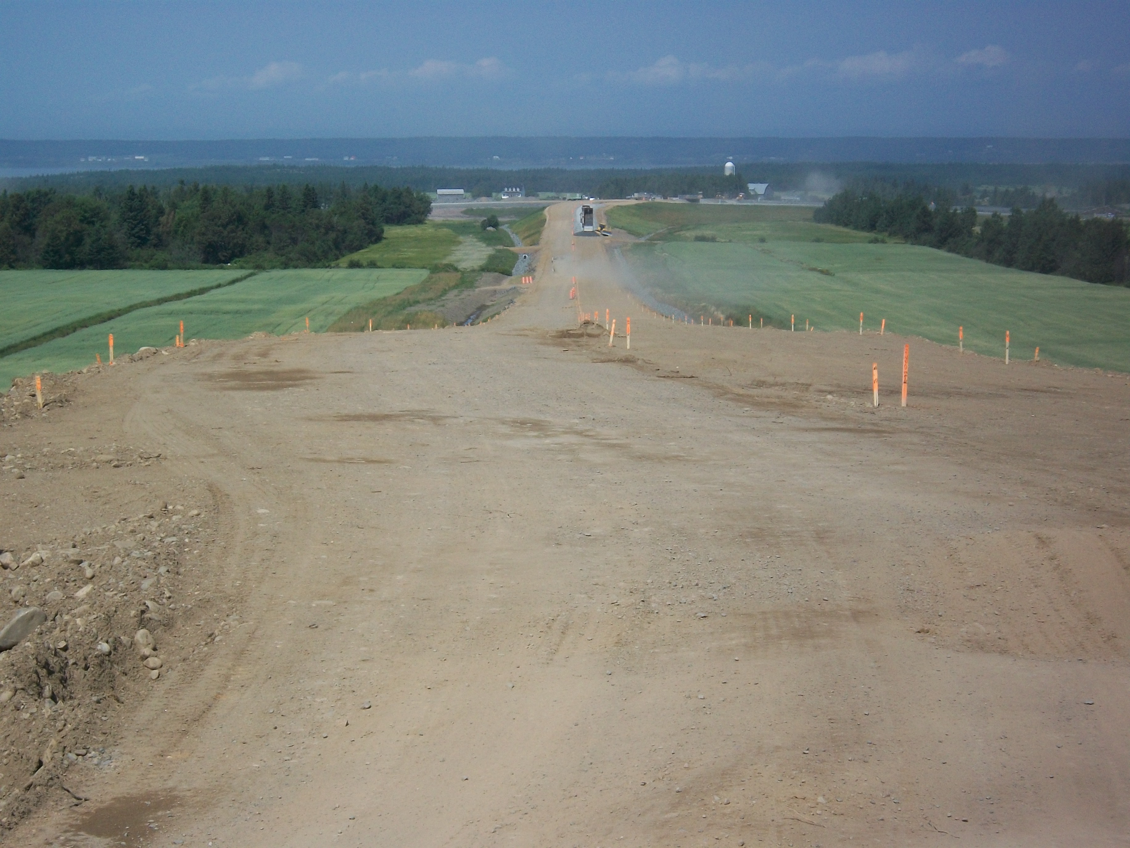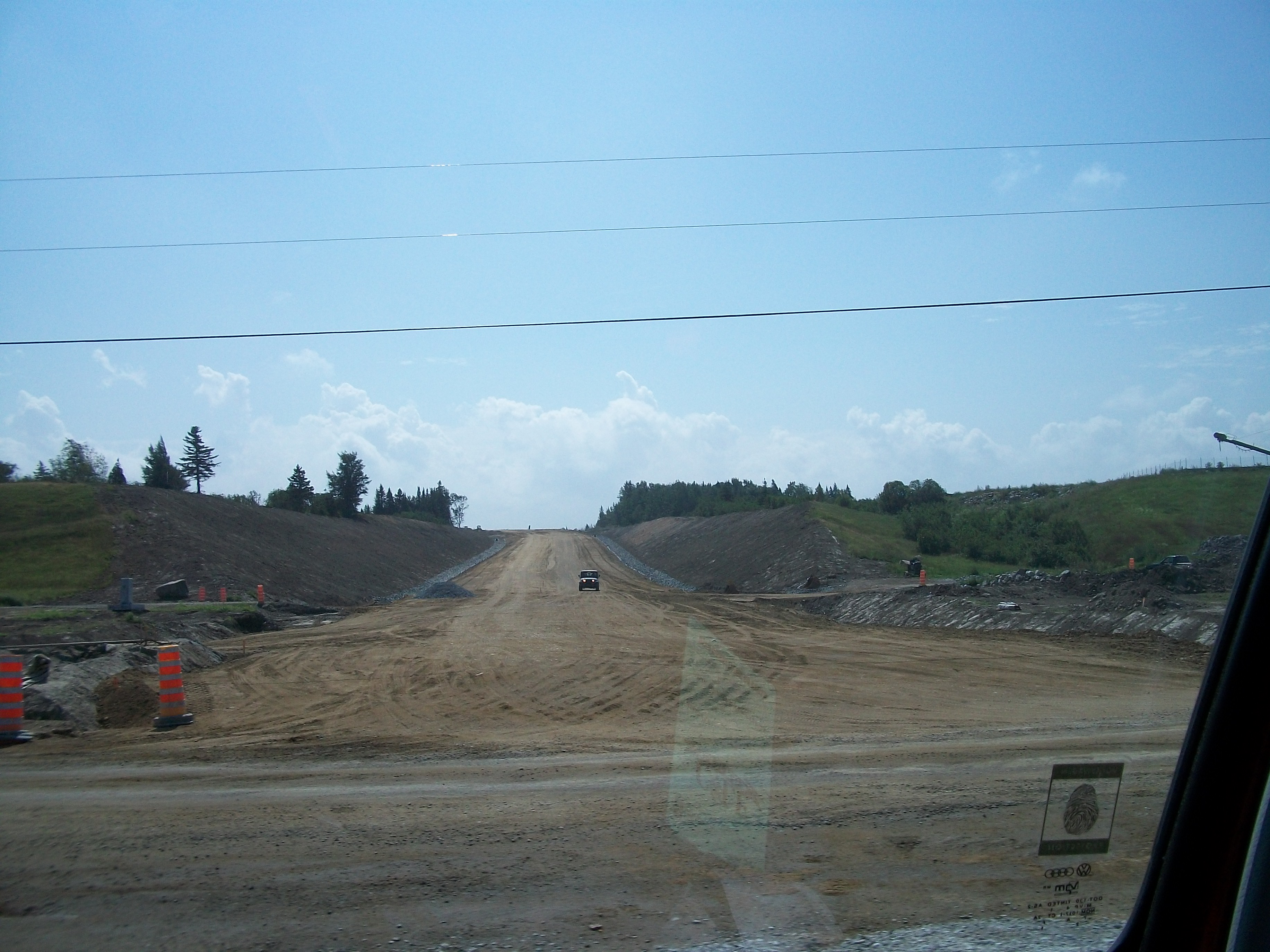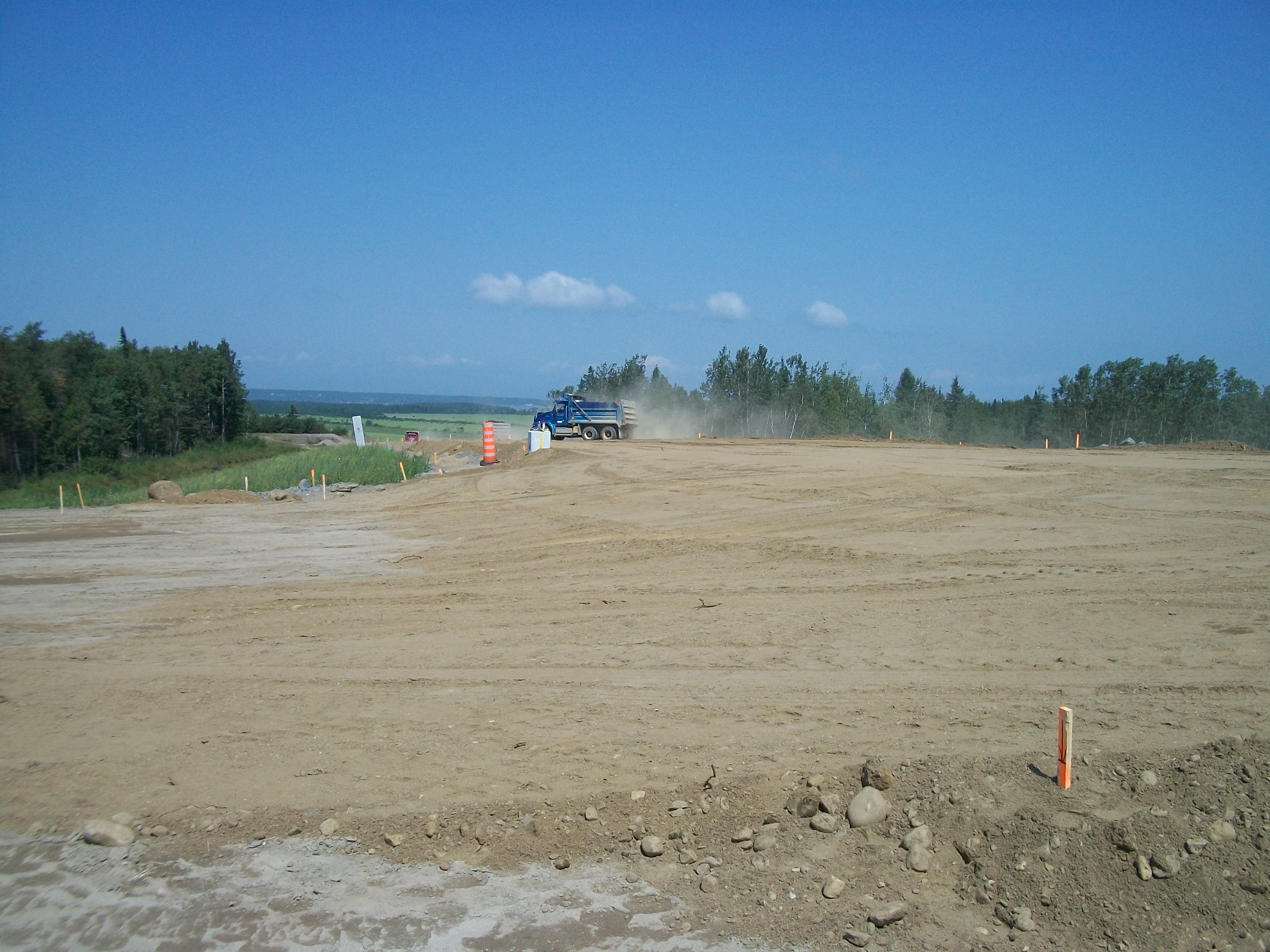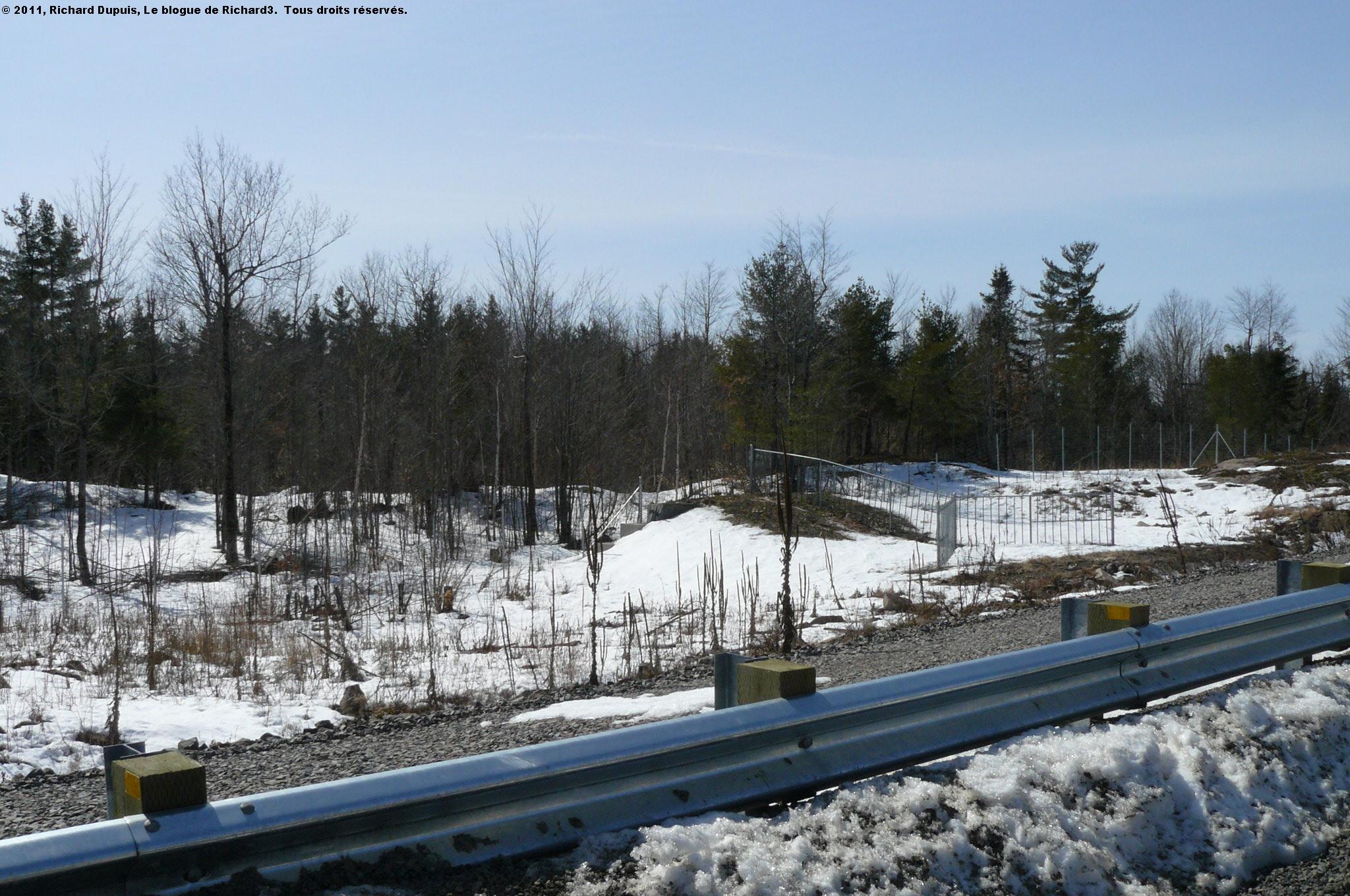 La butte de terre, qui dépasse la barrière de béton, permet de mettre un peu de poids supplémentaire sur ce qui deviendra la bretelle d’accès à l’A-30 est, depuis le chemin de la Haute-Rivière. Elle sera diminuée lors de la construction de la bretelle, à l’intersection de laquelle, si l’on se fie à l’espèce de vieille coupole jaune, juste à droite du panneau, il devrait y avoir des feux de circulation.