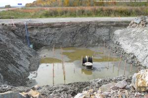 …je peux vous montrer le site du viaduc de la montée Boucher, avec, en arrière-plan, le terrassement de la chaussée de l’A-50, incluant la supersignalisation, qui fut complétée aussi tôt qu’en 2007.  Le viaduc sera soutenu par deux culées, et par une pile centrale.