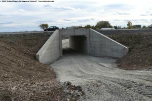 Ici, c’est le troisième passage étagé, qui semble être un autre ponceau voûté, semblable aux deux précédents.  Celui-là aussi se retrouve vis-à-vis une propriété qui n’a pas été expropriée, ce qui porte à croire qu’il s’agit, encore une fois, d’un chemin privé non-répertorié, parce que…