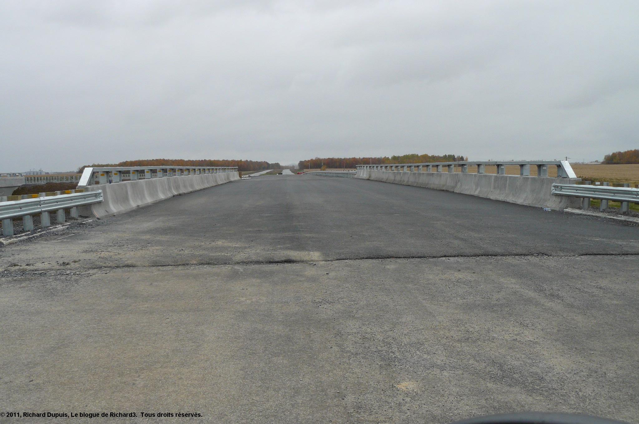 Ici, nous voyons que l’asphalte s’arrête au bas du promontoire.  Il est donc facile de croire que l’échangeur fait partie d’un contrat distinct.  En passant, si je vous dis que j’ai roulé dessus, entre Saint-Alexandre et ce point, c’est tout à fait plausible; d’ailleurs, nous voyons les phares d’un véhicule qui fait pareil!