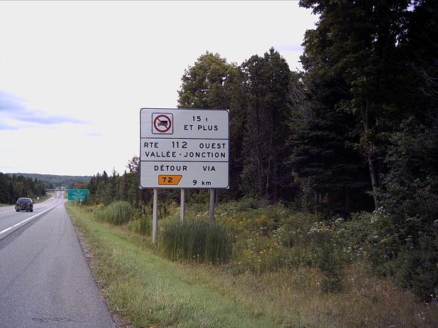 Vue de plus près, on remarque que le panneau de signalisation a été installé temporairement sur des bouts de muret, question de bien indiquer que la sortie 145-O est tout juste là.