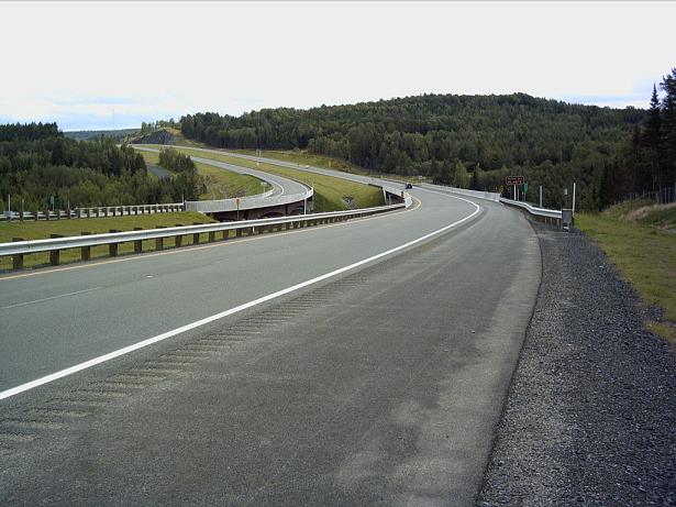 J’ai profité de l’occasion pour vous montrer à quoi ressemble un sautoir à chevreuils. Pour faire sortir les chevreuils de l’emprise de la route, certaines administrations, comme au Nouveau-Brunswick, par exemple, installent des barrières à sens unique, aussi pratiques pour les orignaux, mais dont la fiabilité est parfois douteuse. Au Québec, par contre, on aménage ce type de sautoir dans les secteurs où l’on retrouve surtout du chevreuil. Apeuré par les véhicules, le chevreuil suit la clôture, et monte la petite pente, pour finalement sauter au bout du muret de béton, dont on voit l’extrémité.