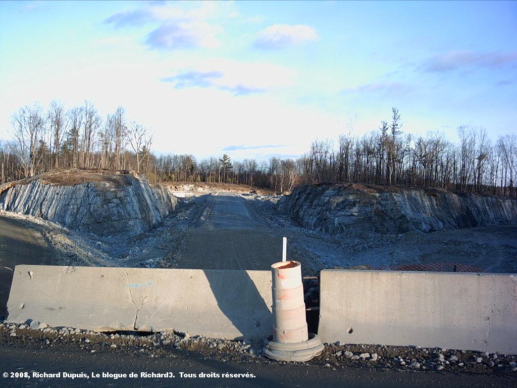 De nos jours, les finances ne sont toujours pas au rendez-vous, mais le volume de circulation y est; l’A-40, à l’endroit où a eu lieu l’accident d’aujourd’hui, supporte pas moins de 40,000 véhicules par jour, en débit journalier moyen annuel (DJMA), unité de mesure du volume de circulation. Il serait grandement temps de compléter ce “chaînon manquant” de l’A-40, à savoir l’axe est-ouest original de l’A-40, entre l’échangeur A-40/A-55 actuel, et la courbe du pont d’étagement de la rue Courteau, soit la ligne rouge, approximativement, sur la photo suivante, issue de Google Earth, et modifiée par votre humble serviteur.