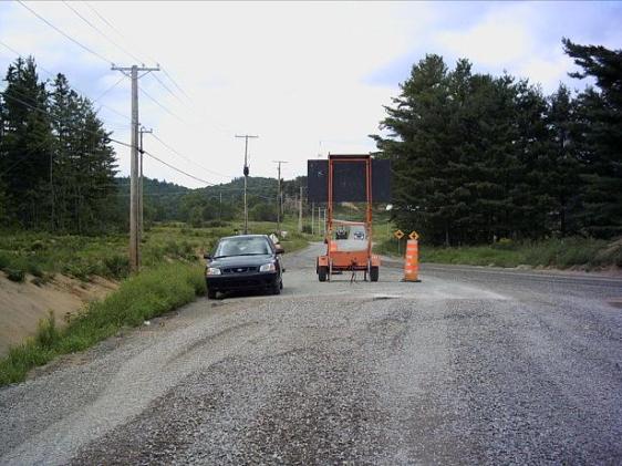 Le chemin Kilmar, vers le nord. Si l’on regarde attentivement, on peut voir, à travers le support de la flèche lumineuse, qu’un camion pick-up dépasse un tracteur de ferme.