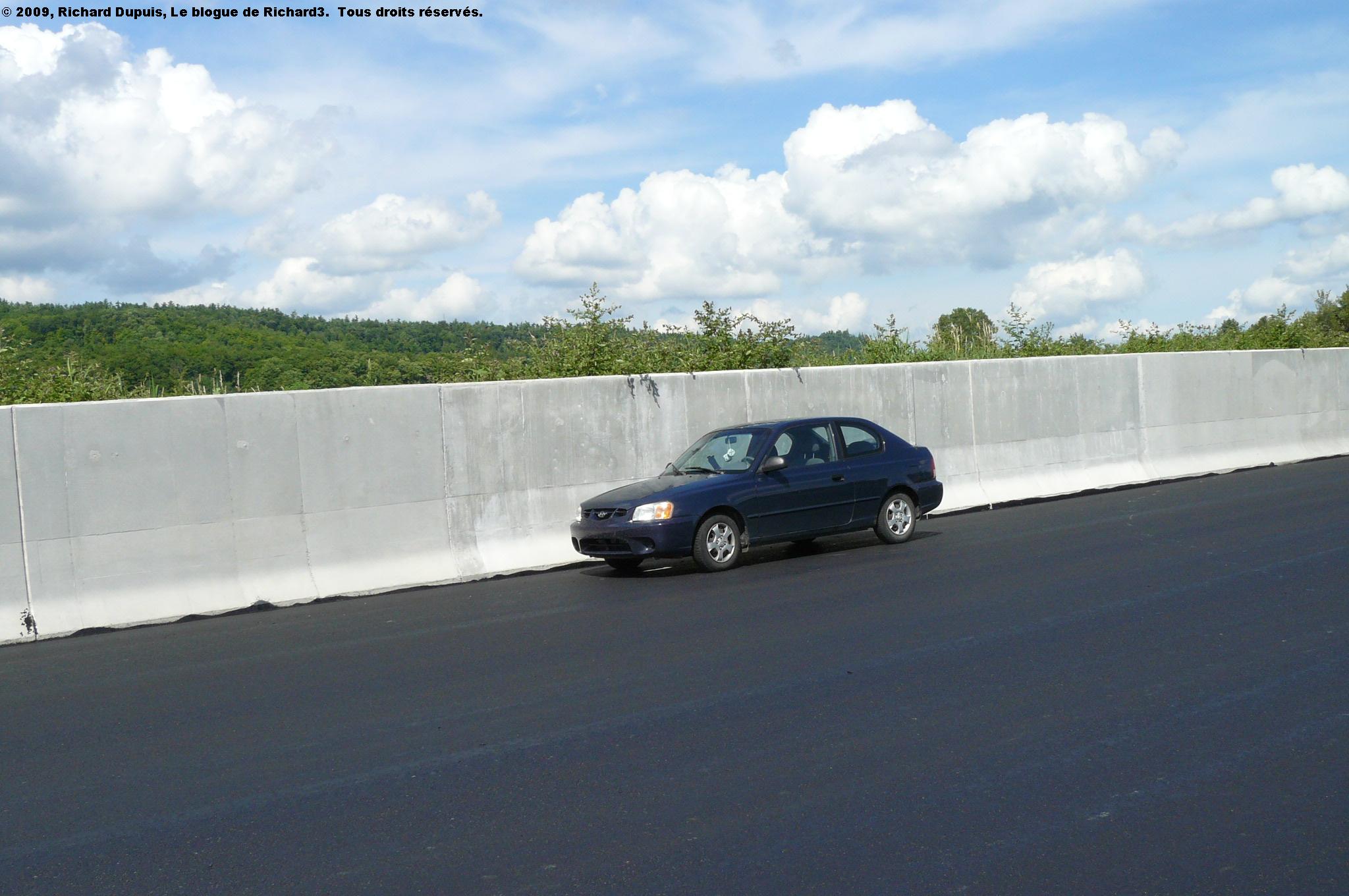 On voit ici l’extrémité du musoir qui séparera les voies de l’A-55 sud de la bretelle vers l’A-20 ouest. De l’autre côté du muret, c’est l’A-55 actuelle.