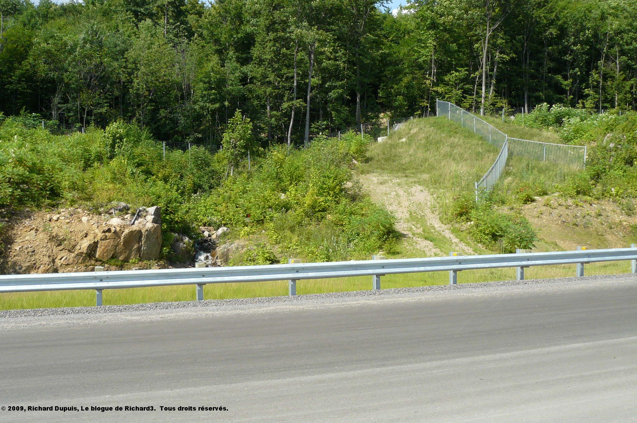 Ça, c’est où le chevreuil atterrit. C’est juste assez haut pour l’empêcher de retourner vers l’autoroute. De tels sautoirs ont aussi été aménagés le long de l’autoroute Guy-Lafleur (A-50), en Outaouais.