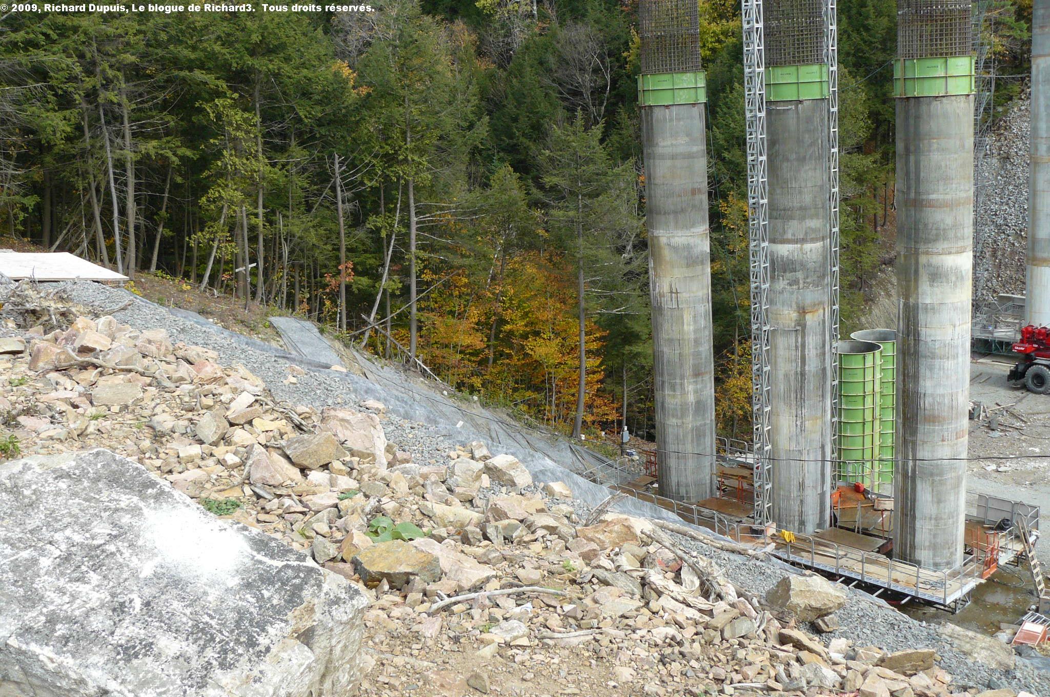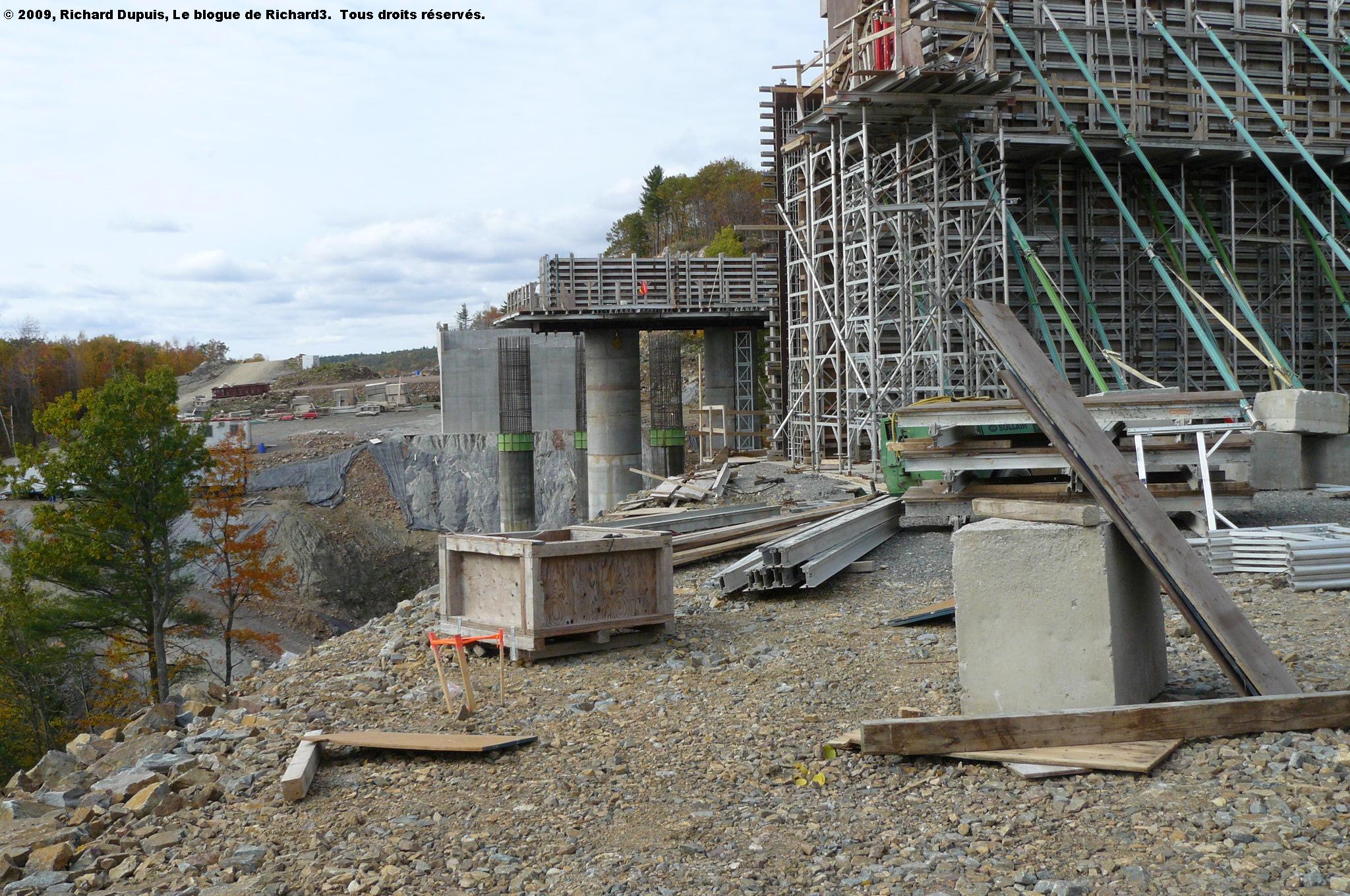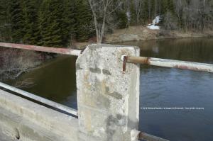 Le béton de cette poutrelle s’est effrité. Rien de nouveau sous le soleil, me direz-vous. Mais voilà; il y a des ponts, sur le réseau routier québécois, qui sont toujours en service, et dont le béton est beaucoup plus effrité que celui-ci. Bon, je dois aussi avouer que je ne suis pas allé voir en-dessous.