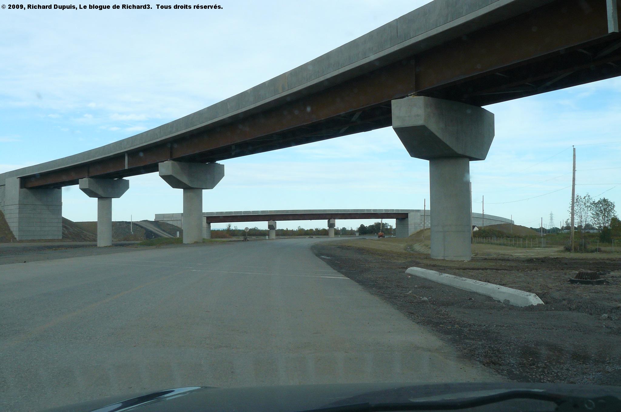 Depuis des années, je lis des trucs sur l’autoroute 6, une de ces autoroutes québécoises qui ne seront finalement jamais construites. Les vestiges les plus évidents furent détruits lors de la reconstruction de l’A-15, sur la rive-sud de Montréal. Les fondations des portails de signalisation étaient en place pour un échangeur en T, et les deux chaussées de l’A-15 s’éloignaient l’une de l’autre pour faire place à l’échangeur, le tout au niveau du kilomètre 49, environ. Aujourd’hui, plus rien de cela n’existe. Les dernières preuves d’une possible autoroute dans ce secteur sont visibles sur le boulevard Taschereau. Je les ai prises en photos à l’automne de 2006.
