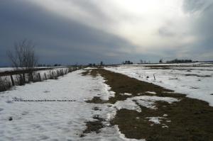 Pour vous donner une idée de l’endroit où se trouve la route, imaginez une ligne à peu près droite entre le sillon plus profond, à l’avant-plan, et la ligne des arbres, au milieu de la photo. Je devais me fier à la présence de cailloux dans le sol, afin de m’aligner. L’exercice devenait plus facile à mesure que je m’approchais des arbres,…