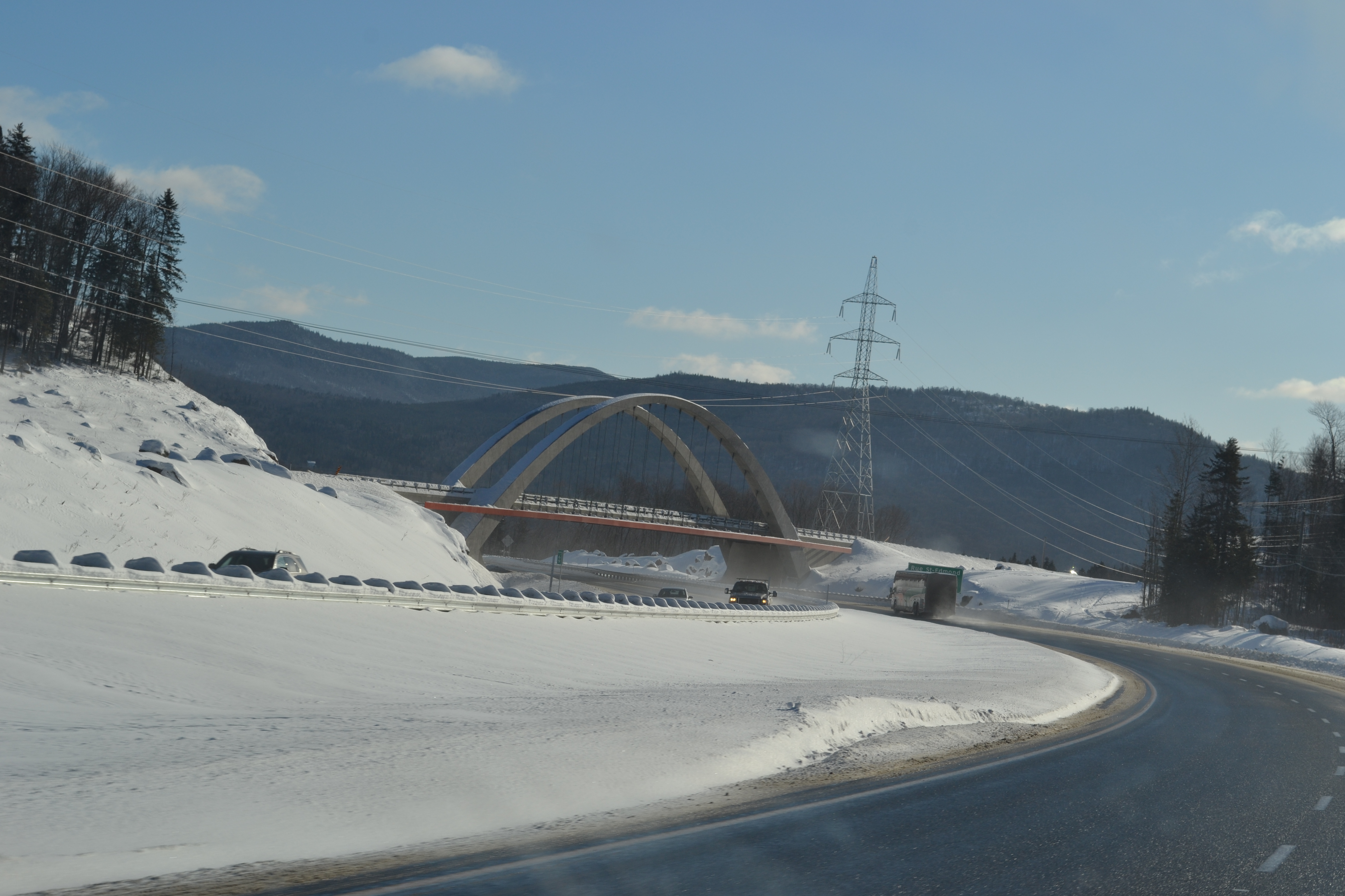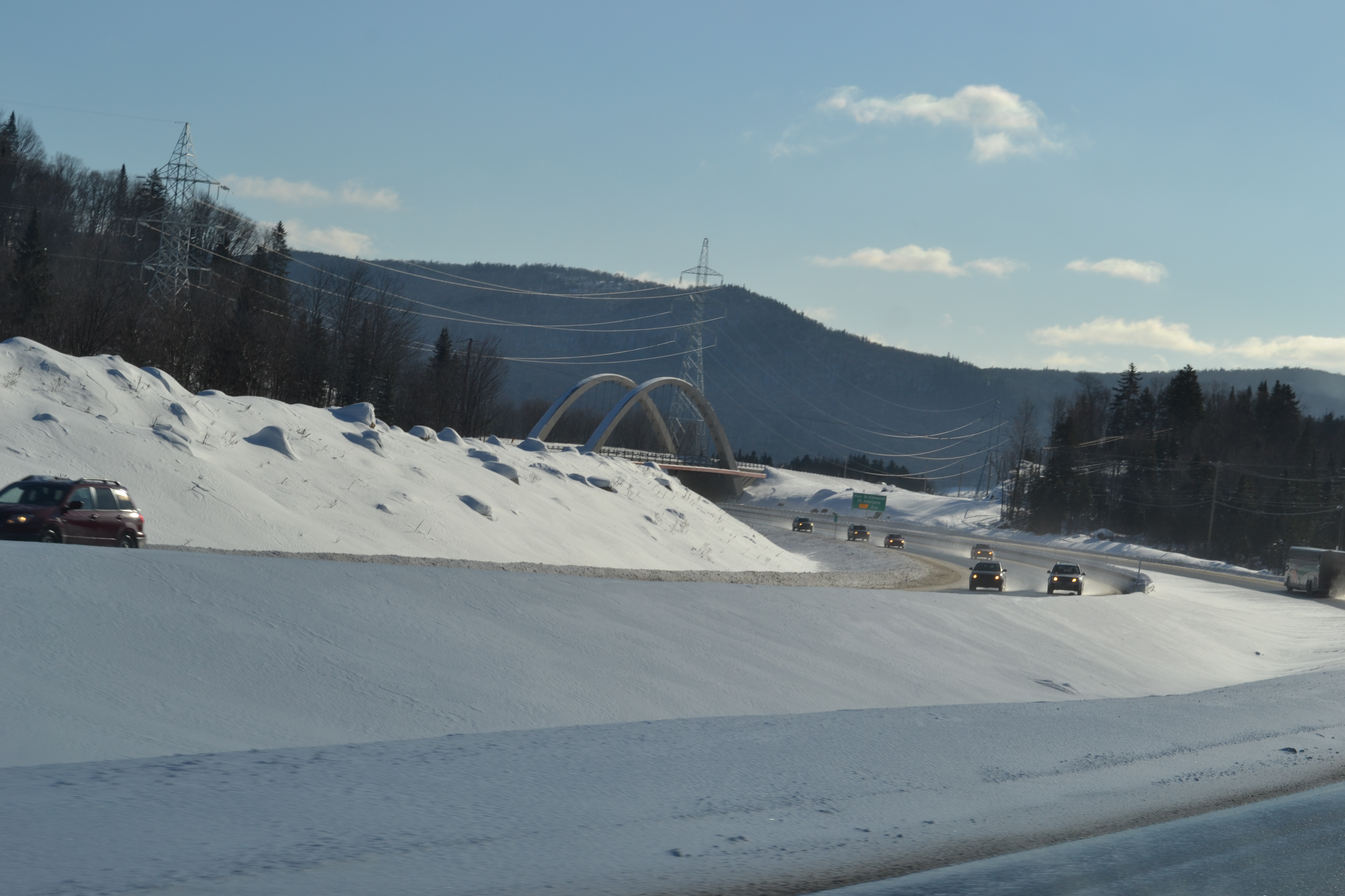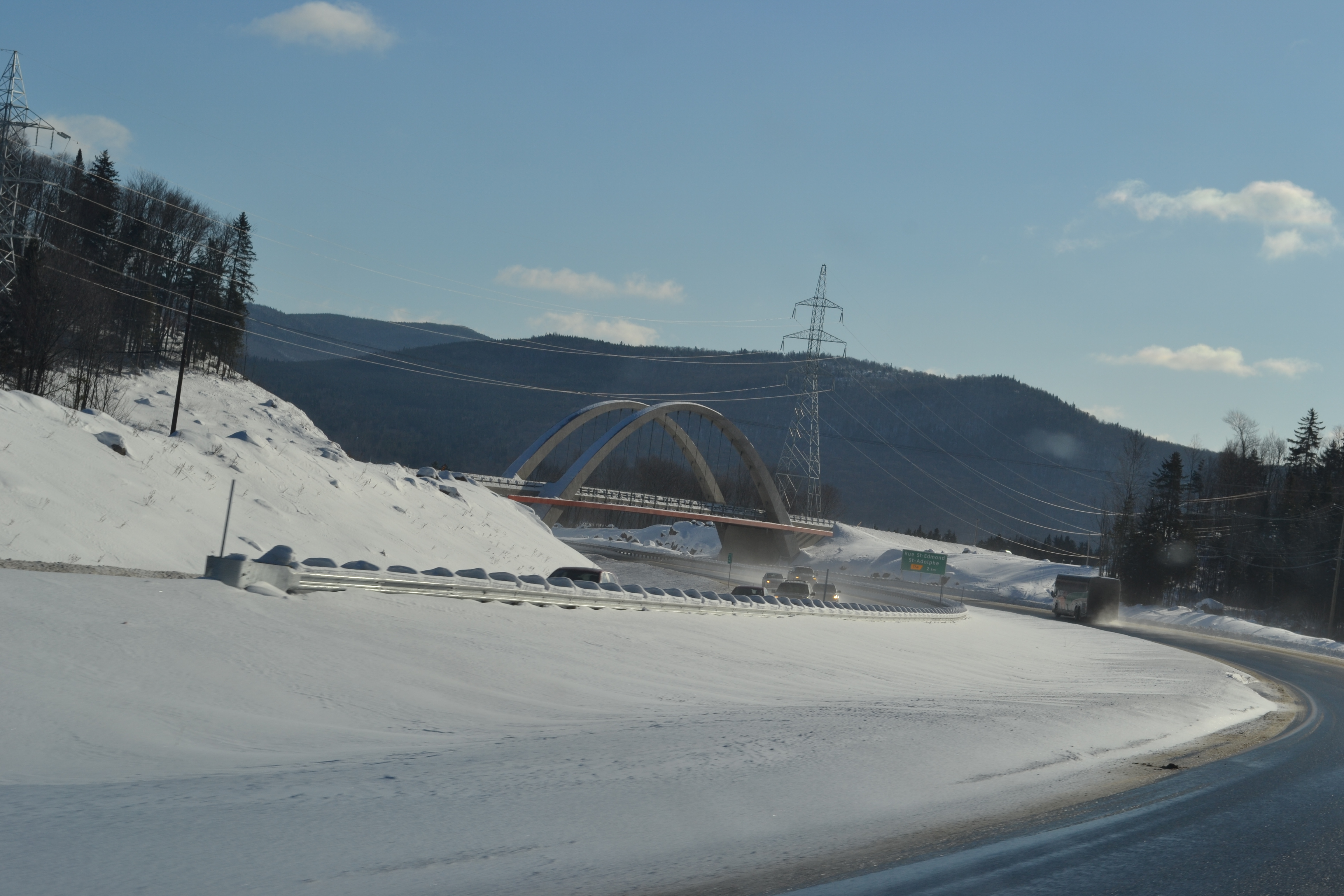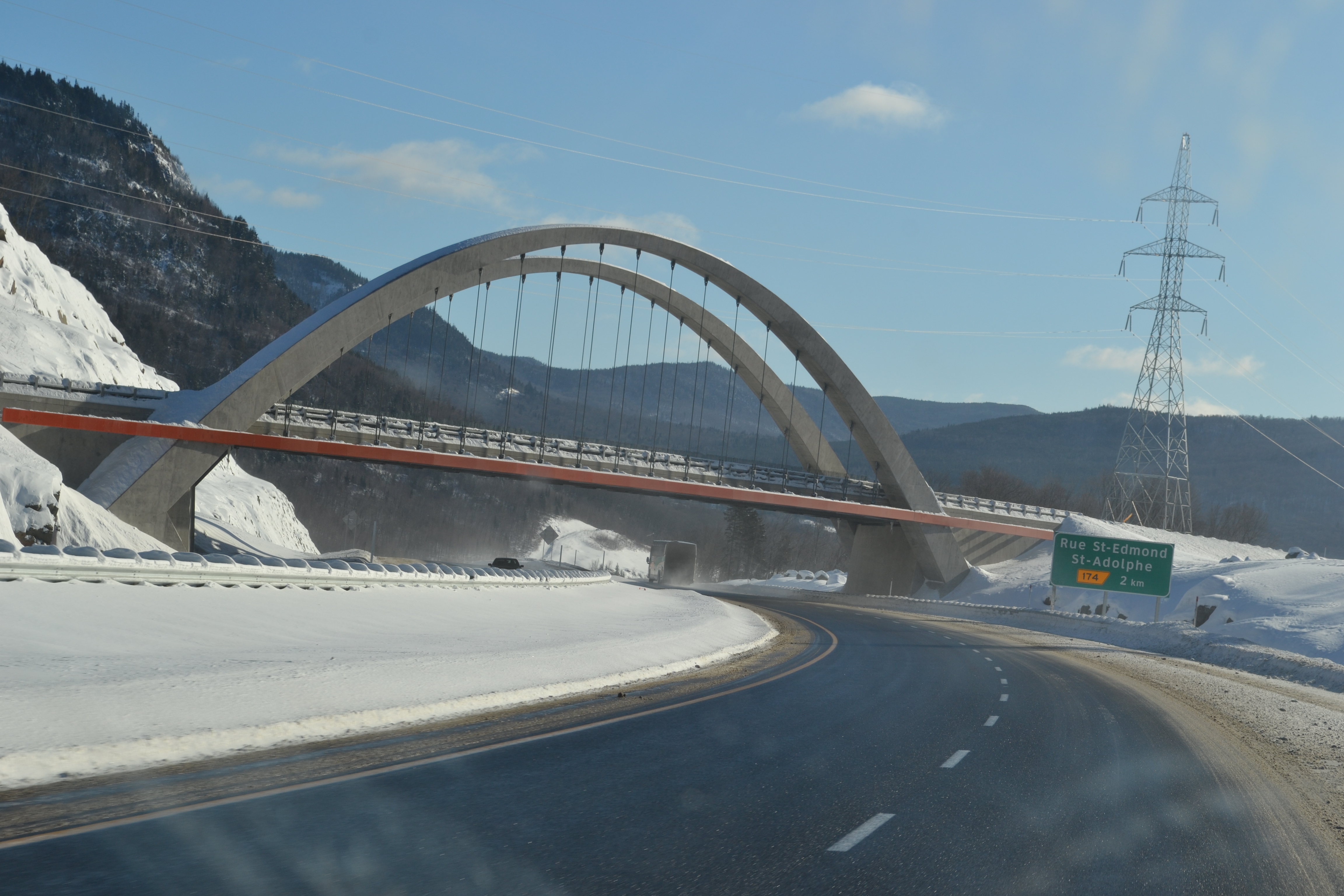 Nous voyons que la “route” devient de plus en plus une “autoroute”; une fois la longue pente descendue, les pylônes de lignes électriques, et le poste de contrôle routier passés, les panneaux s’agrandissent.  La sortie 182, premier réel échangeur autoroutier, mène vers le chemin du Panorama¹, et accessoirement vers le boulevard Talbot. Par la suite, on voit apparaître le fameux pont en arche dont le MTQ a parlé longtemps, sur son site web.